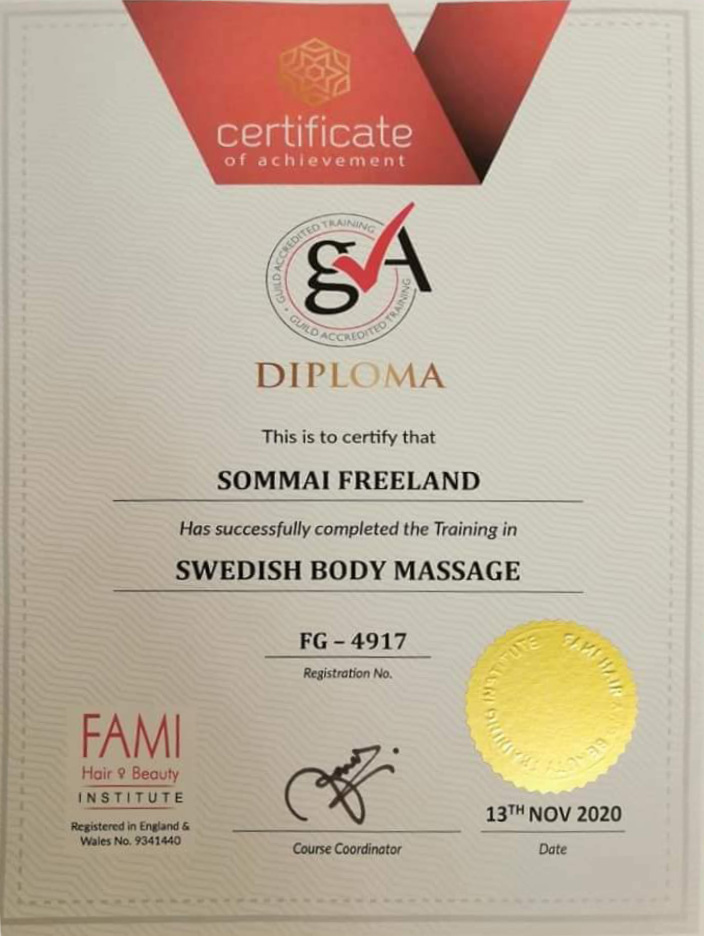 My name is Sommai I am a professional massage therapist over 30 years. 32 years ago I became fully qualified after training at the very prestigious Wat Po College in Bangkok. I have since advanced my qualifications by extensive training at the UTTMS (The Union of Thai Traditional Medicine Society), and more in United Kingdom such as from VTC T level 3 Diplomas in Sports Massage Therapy, Swedish Body Massage, Thai Massage, Deep Tissue Massage and Reflexology Massage.